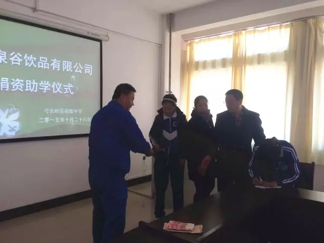 2015年10月28日,汤泉谷公司的工作人员来到了风景秀丽的弓长岭区初级中学,向贫困家庭的初中生捐赠了助学金。