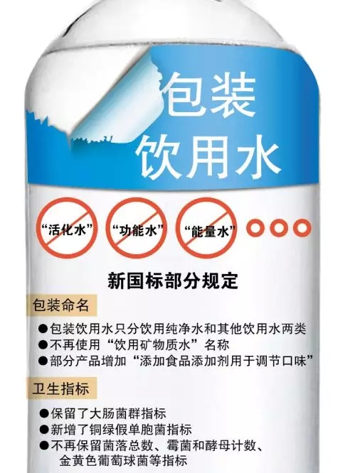 新规指出,除了达到相关标准的天然矿泉水外,市面上在售的饮用水将被归为两类:饮用纯净水和其他饮用水。而且,“蒸馏水”“活化水”“小分子团水”“功能水”“能量水”等名称,都将被禁止出现在外包装标签上。也就是说,五花八门的包装饮用水将迎来一大波更名潮、换装潮。